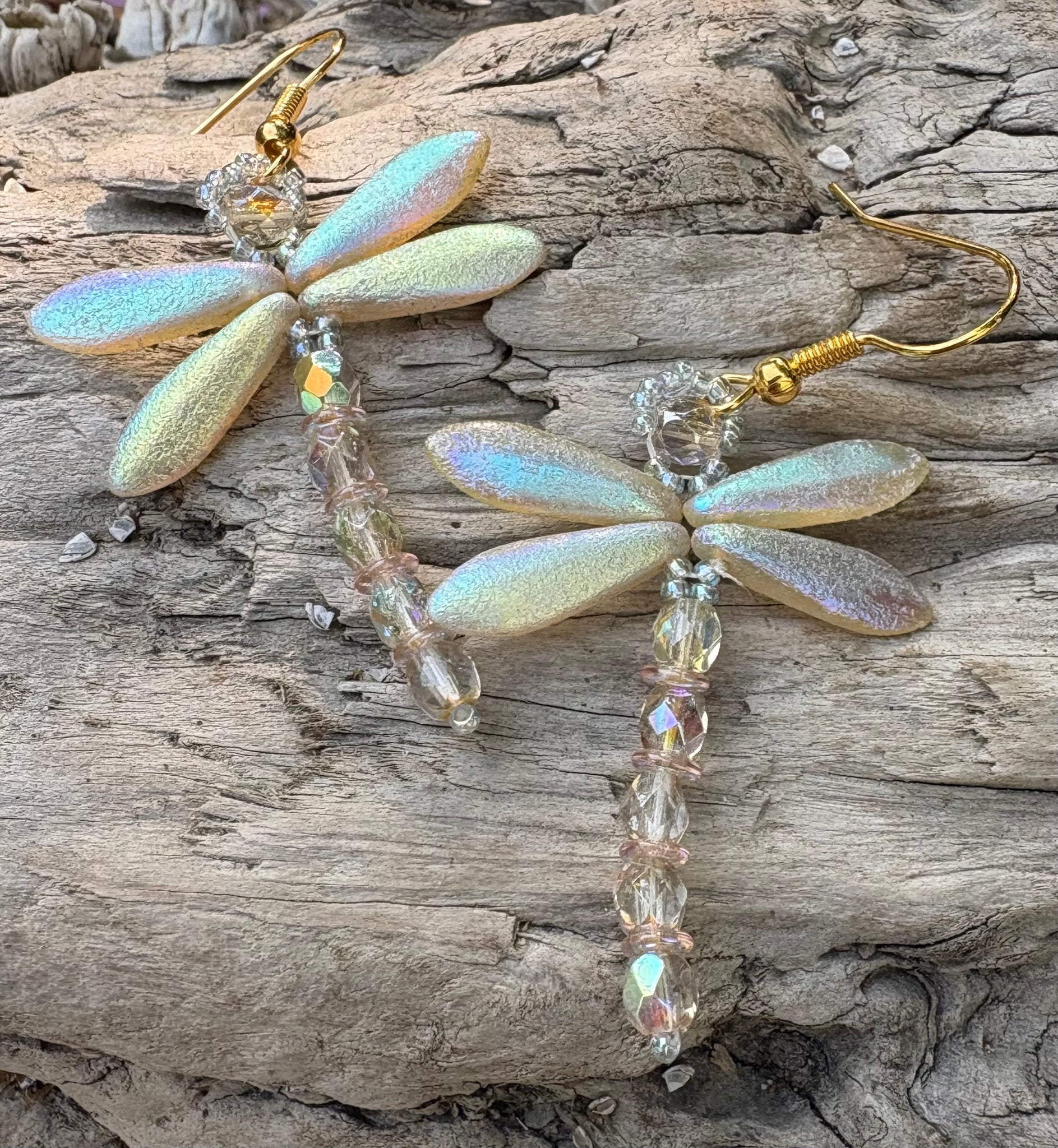 This pair of shimmering dragonfly earrings floats in on the first warmth of summer. The pair is beaded with Czech Fire Polished glass components and dangle just a smidge over 2” from the top of the ear wire to the top of its tail. The weight is so low it can’t register on the digital scale (grams or ounces)!