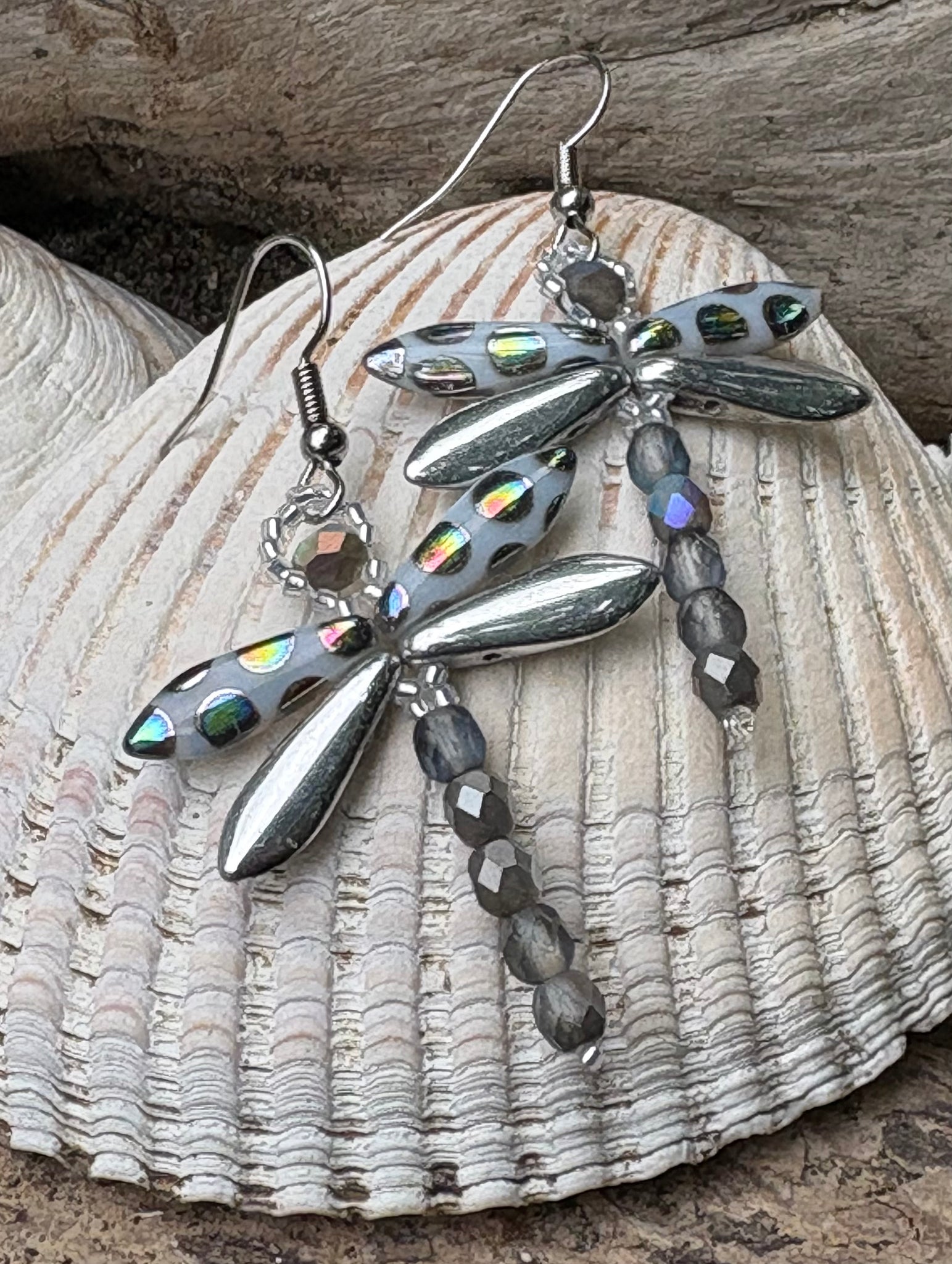This pair of shimmering dragonfly earrings floats in on the first warmth of summer. The pair is beaded with Czech fire polished glass crystals and dangle just under 2” from the top of the ear wire to the top of its tail. The weight is so low it can’t register on the digital scale (grams or ounces)!