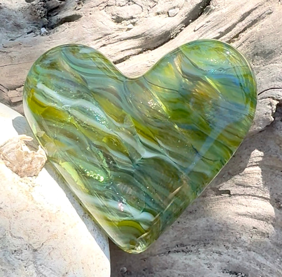 Multicolored greens in waves of iridescent twisted glass cane make up this Fused Glass Heart - 12mm thick.