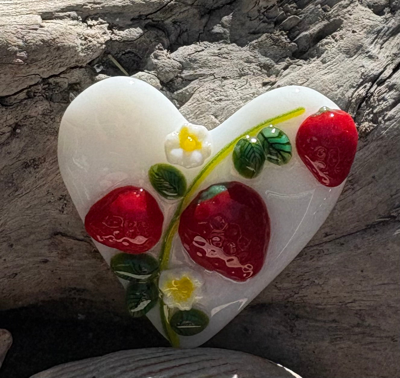 White Opalescent Fused Glass Heart adorned with juicy strawberries! The glass strawberry vine holds 3 strawberries, 2 flowers and a handful of green Murrini leaves - 2” across and 12mm thick.