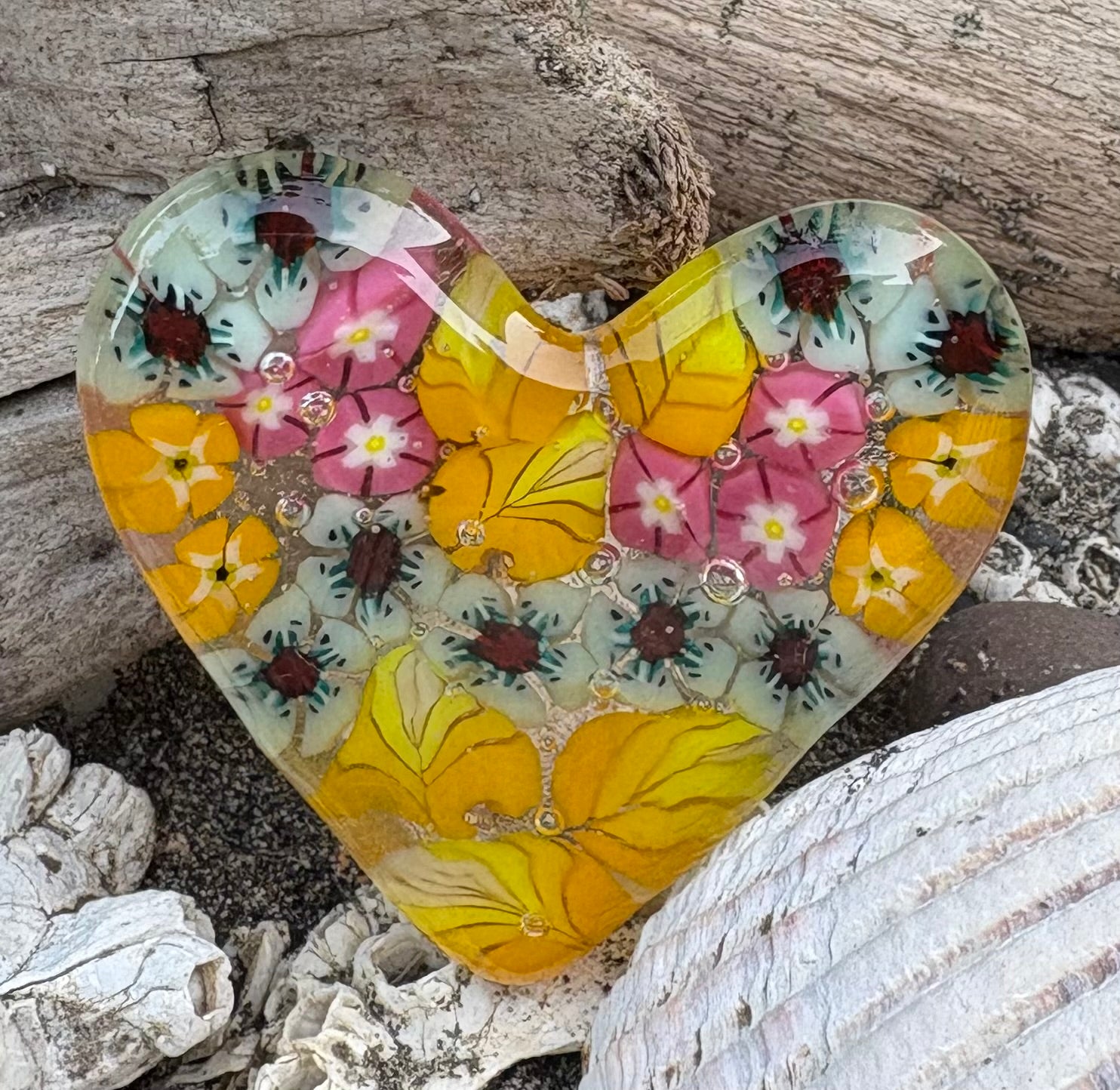 Clear base Fused Glass Heart with Murrini flowers and leaves to include  dark pink, yellow mimosa flowers, mint/turquoise/red flowers and spring yellow leaves. 14mm thick and 2” across.