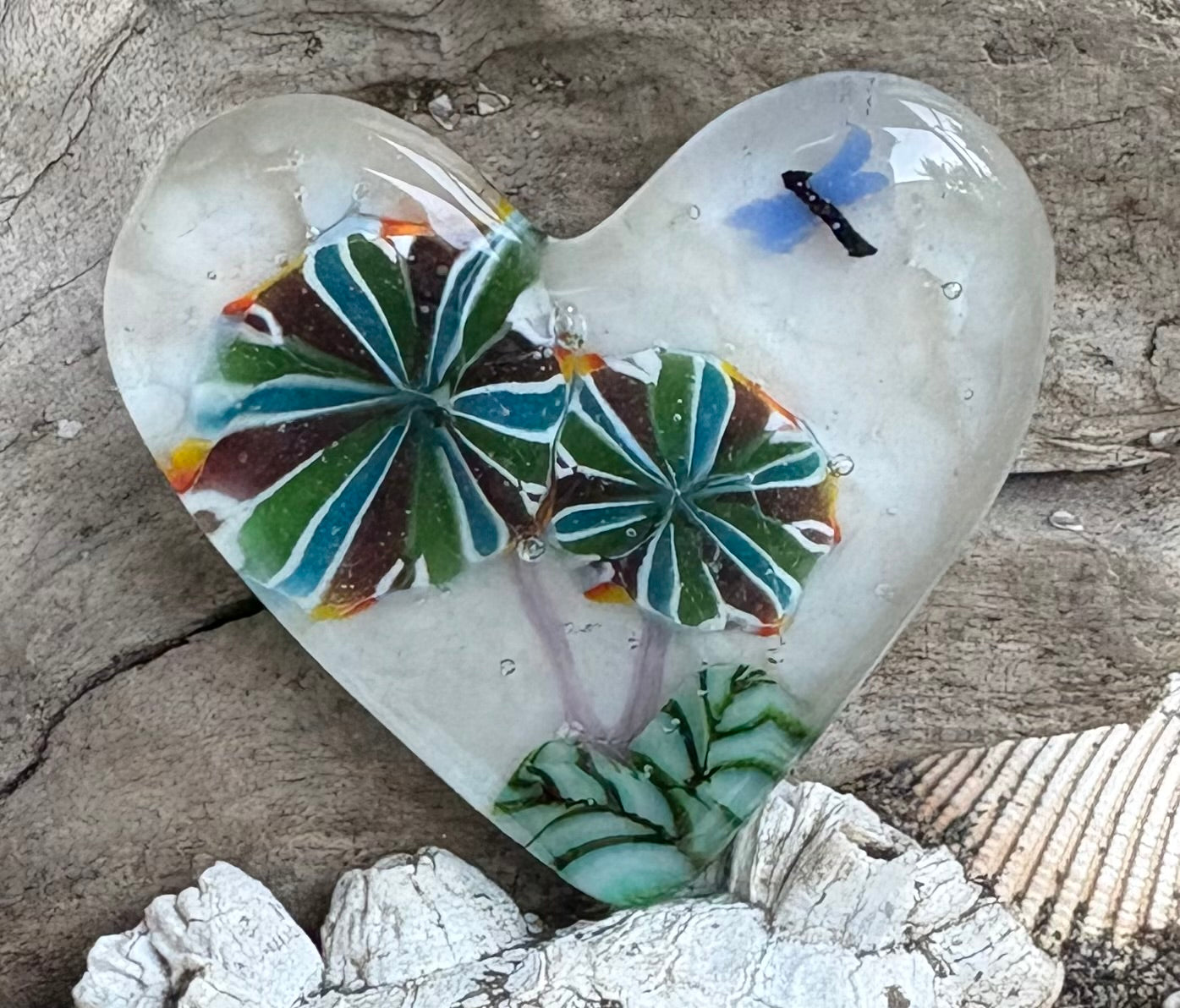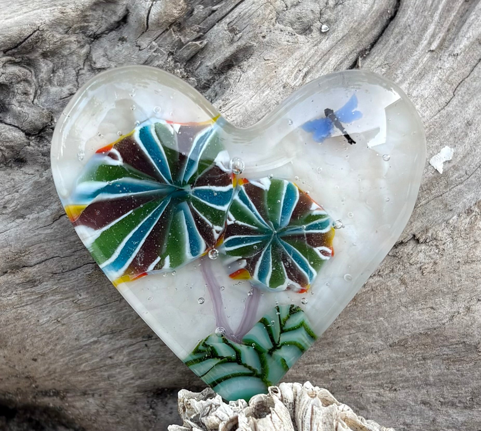 Opalescent light peach cream Fused Glass Heart with Murrini flowers and dragonfly. 12mm thick and 2” across.
