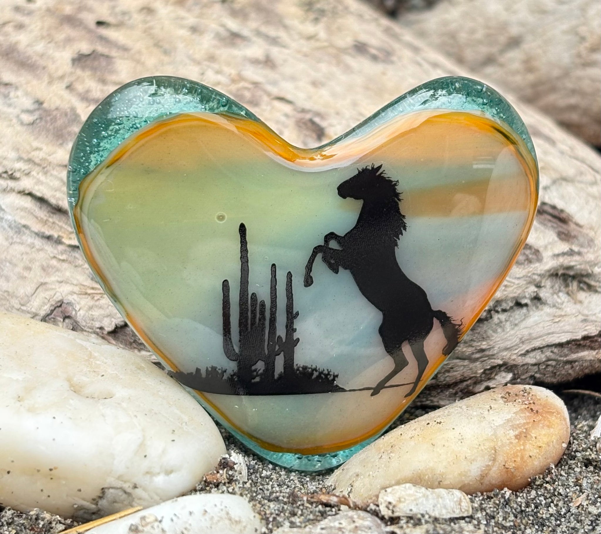 Opalescent and Transparent Fused Glass Heart with a desert Mustang - 2” across and 10mm thick.