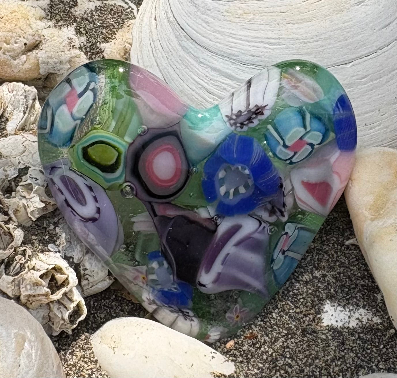 Opalescent and Transparent Fused Glass Heart with a varieties of flowers in blues, purples, pinks, and greens- 2” across and 14mm thick.