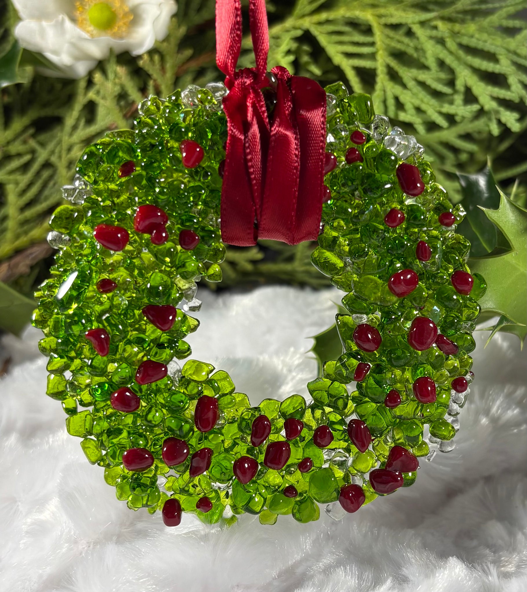 This handmade fused glass ornament combines glass elements formed into a wreath. This ornament measures 3 1/4 ” round and is finished with a red hanging cord.