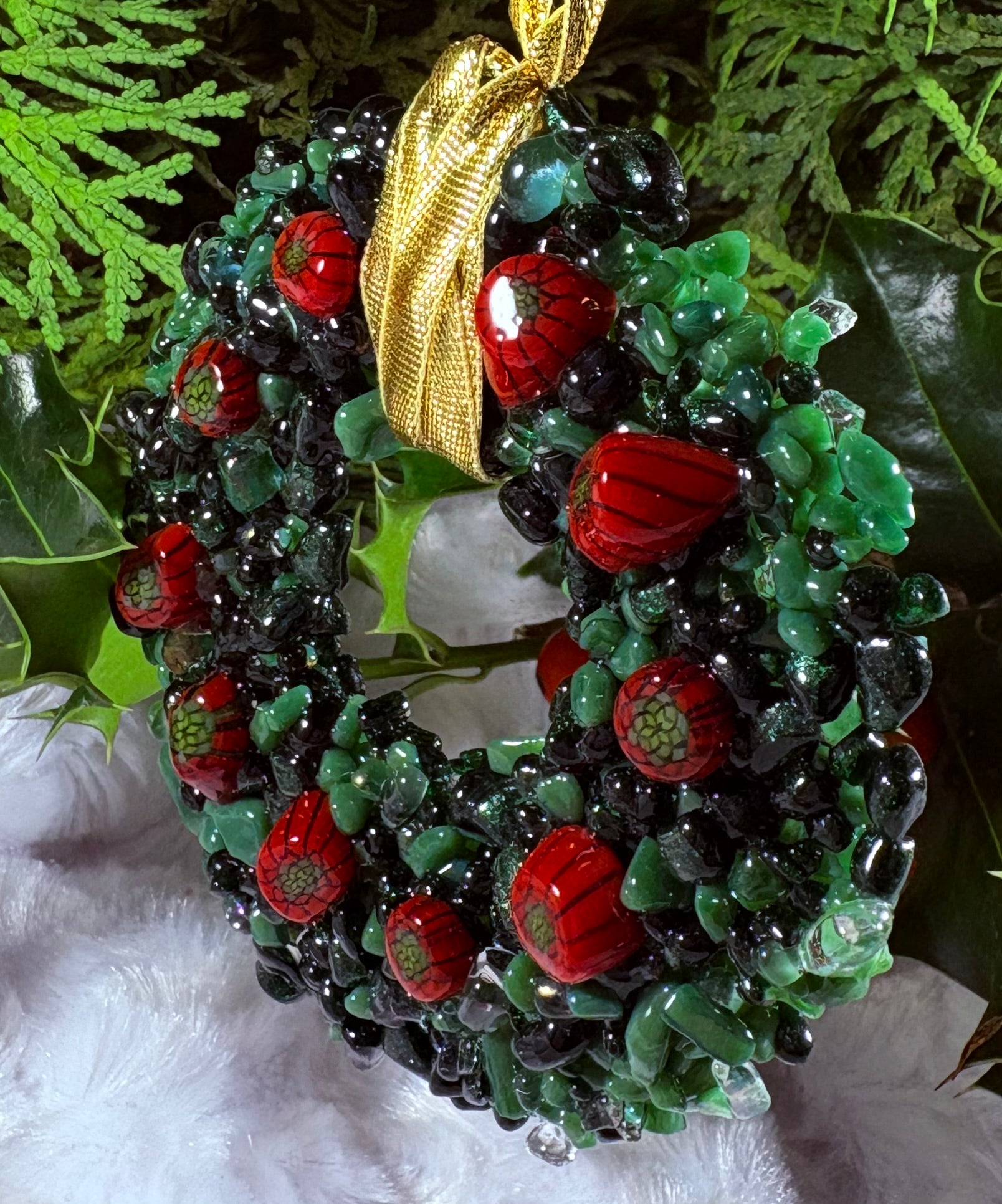 This handmade fused glass ornament combines glass elements formed into a wreath. This ornament measures 3 1/4” round and is finished with a gold hanging cord.