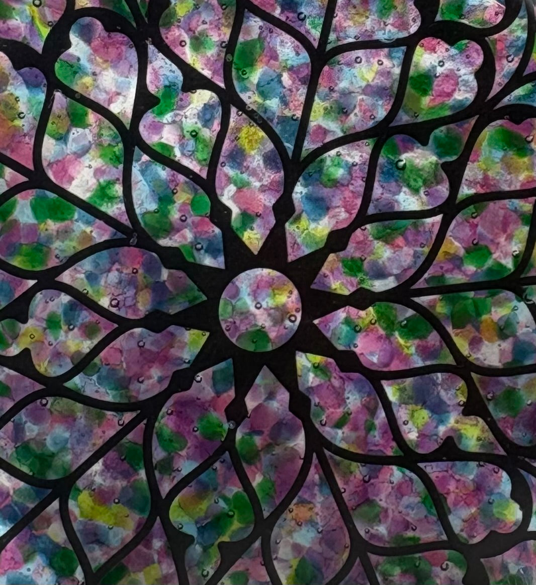 This lovely fused glass ornament measures 3 3/8” round and can be placed on a tree branch or hung in a window.