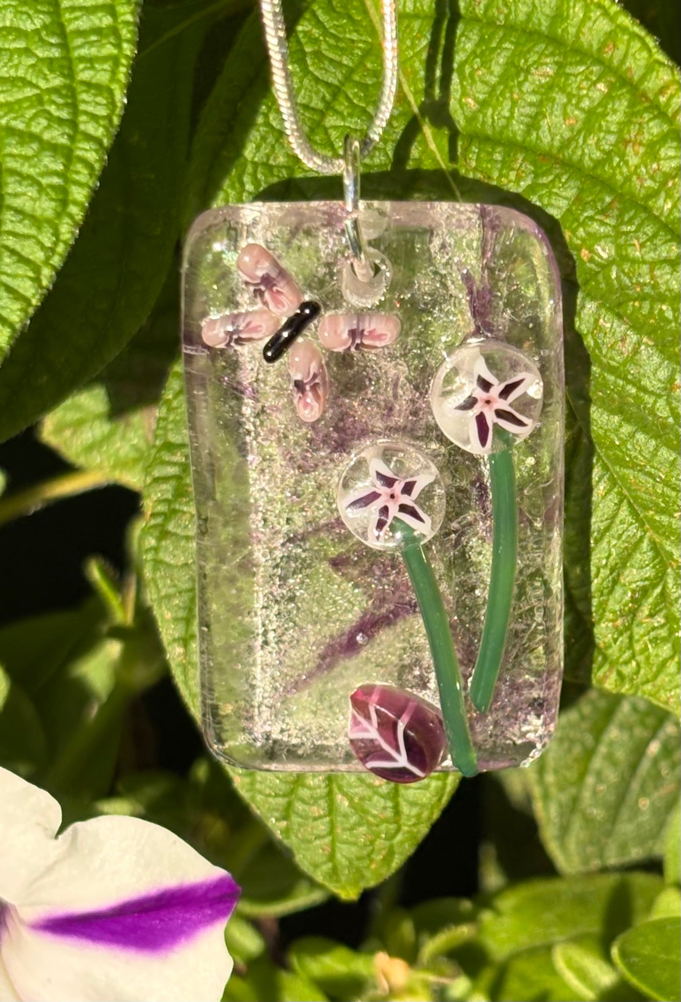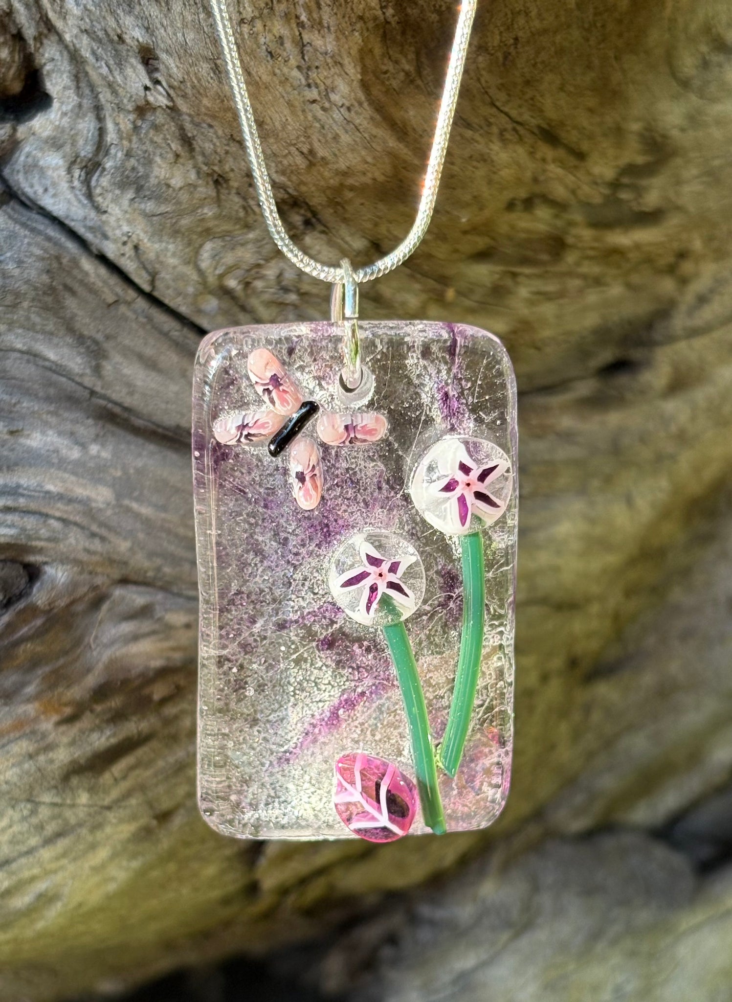 This pendant in purple and clear sets the base for our butterfly to visit the purple blooms. This fused glass pendant comprises Murrine flowers, leaves and, of course, a tiny flirty butterfly. This pendant measures 1 ” x 1 3/4” and is finished with a 23 3/4” silver snake cord with a lobster clasp.