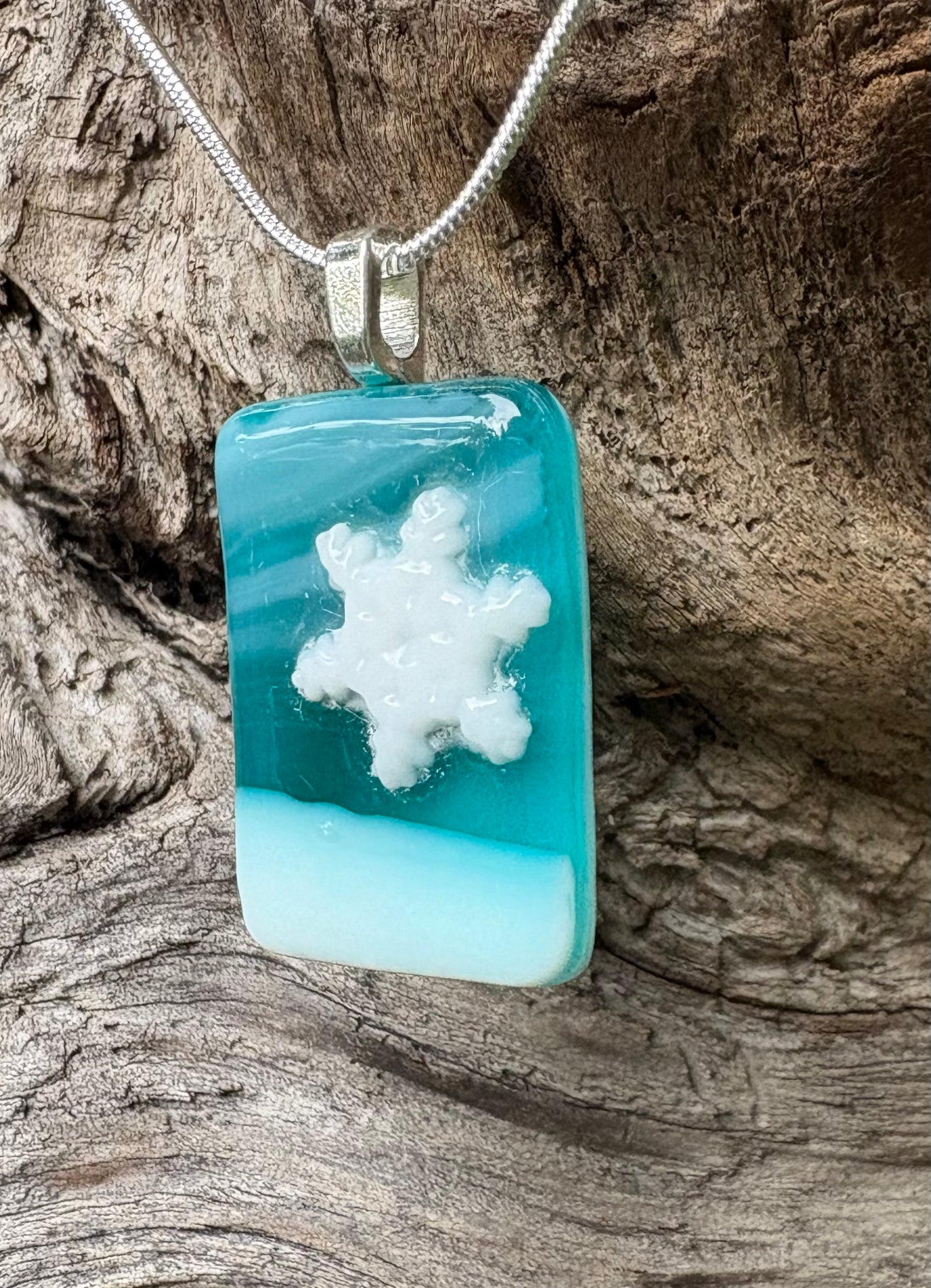 On Peacock Blue Streaky from Bullseye Glass, this singular falling snowflake eclipses the terrain. This pendant measures 1 1/4” x 5/8” (including bail length) and is finished with a silvery snake chain with a lobster clasp that measures 18”. This necklace pendant is ideal for a petite individual.
