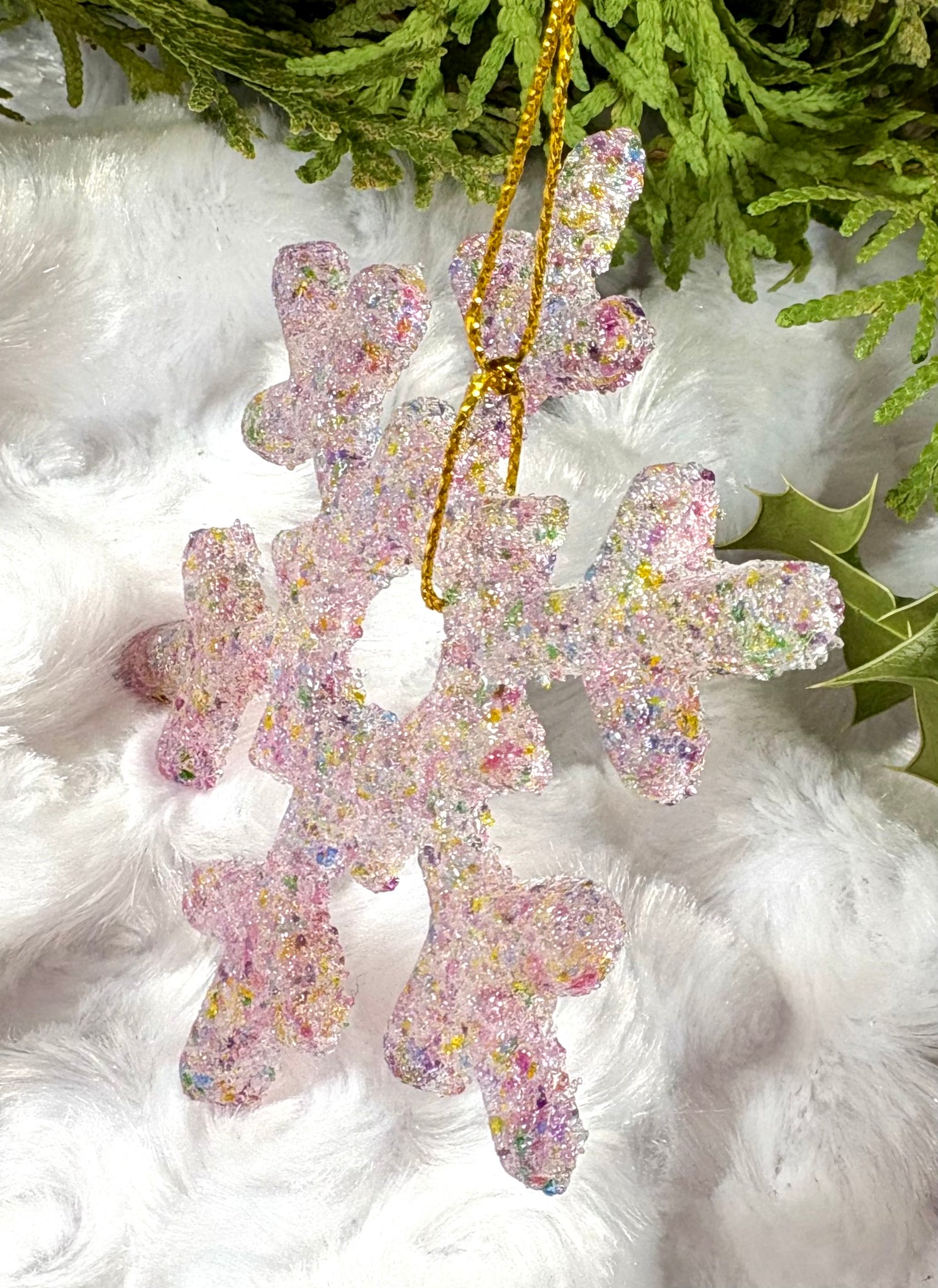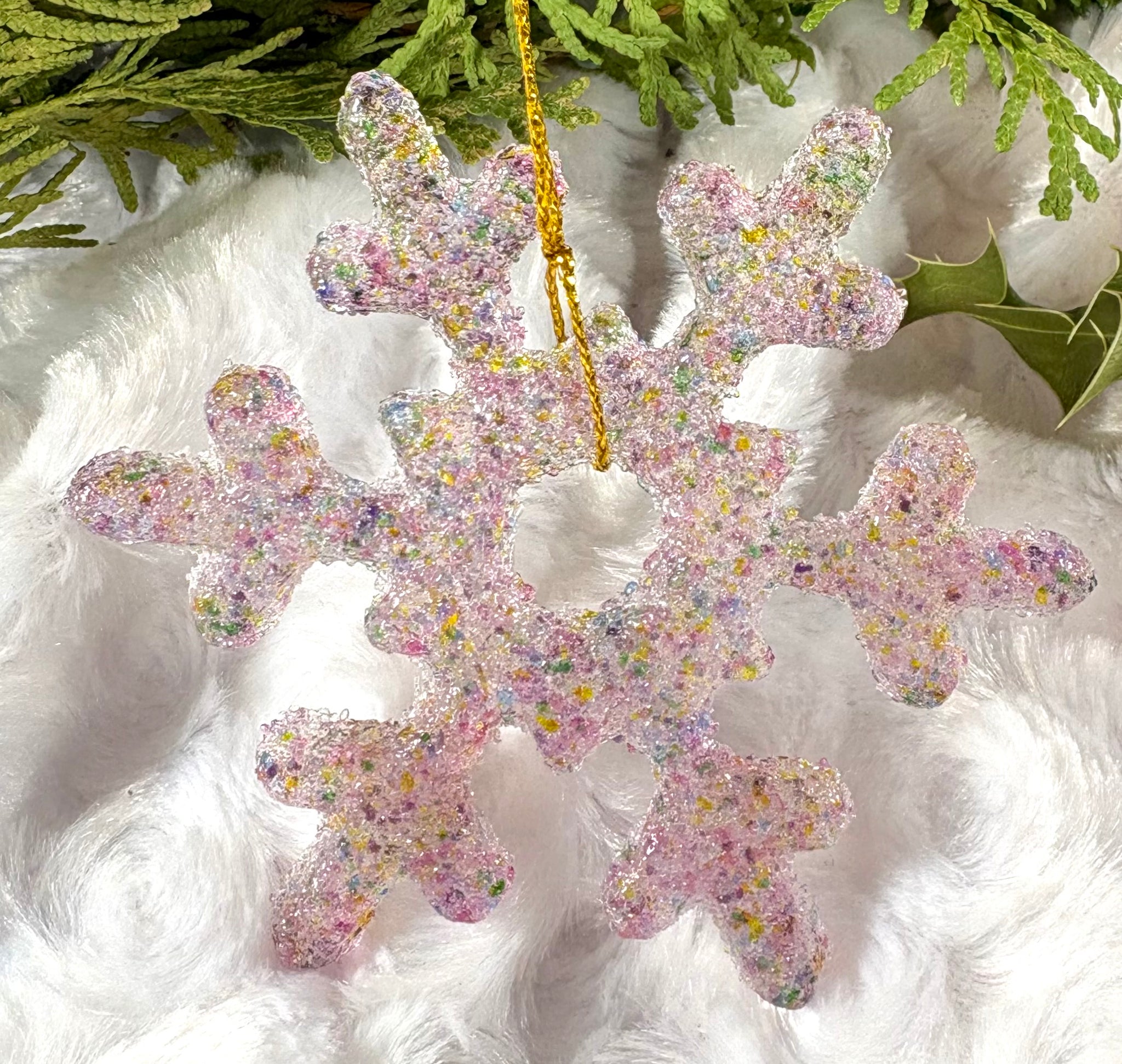 This 3 1/4 “ little snowflake is created using a process called Color de Verre. The snowflake is comprised of tiny pieces of broken glass called frit, and in this case, the size of the frit is fine (not medium or coarse). This handmade fused glass snowflake ornament weighs just under 1/2 an ounce.