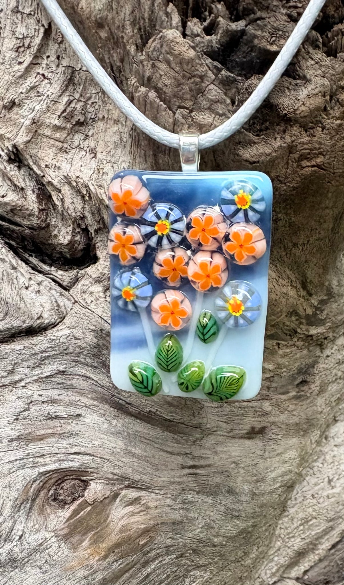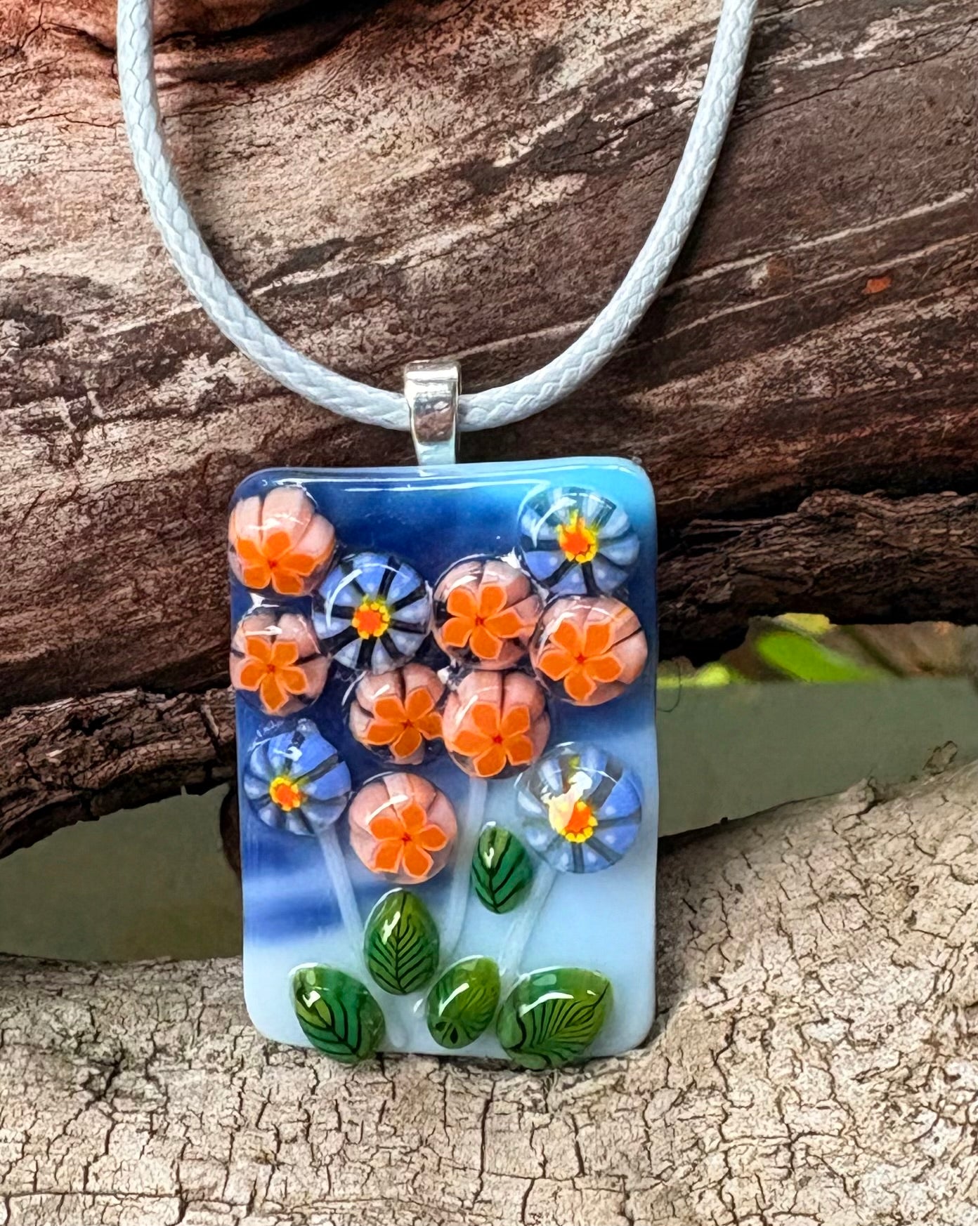 The storm soaked field is surprisingly bright with these blue and orange flowering beauties, as they bring light to an otherwise dreary setting. This whimsical pendant measures just over 1 1/2” x 1”. The gray colored waxed Irish cotton cord is adjustable from 17 3/4” to 19 3/4”.