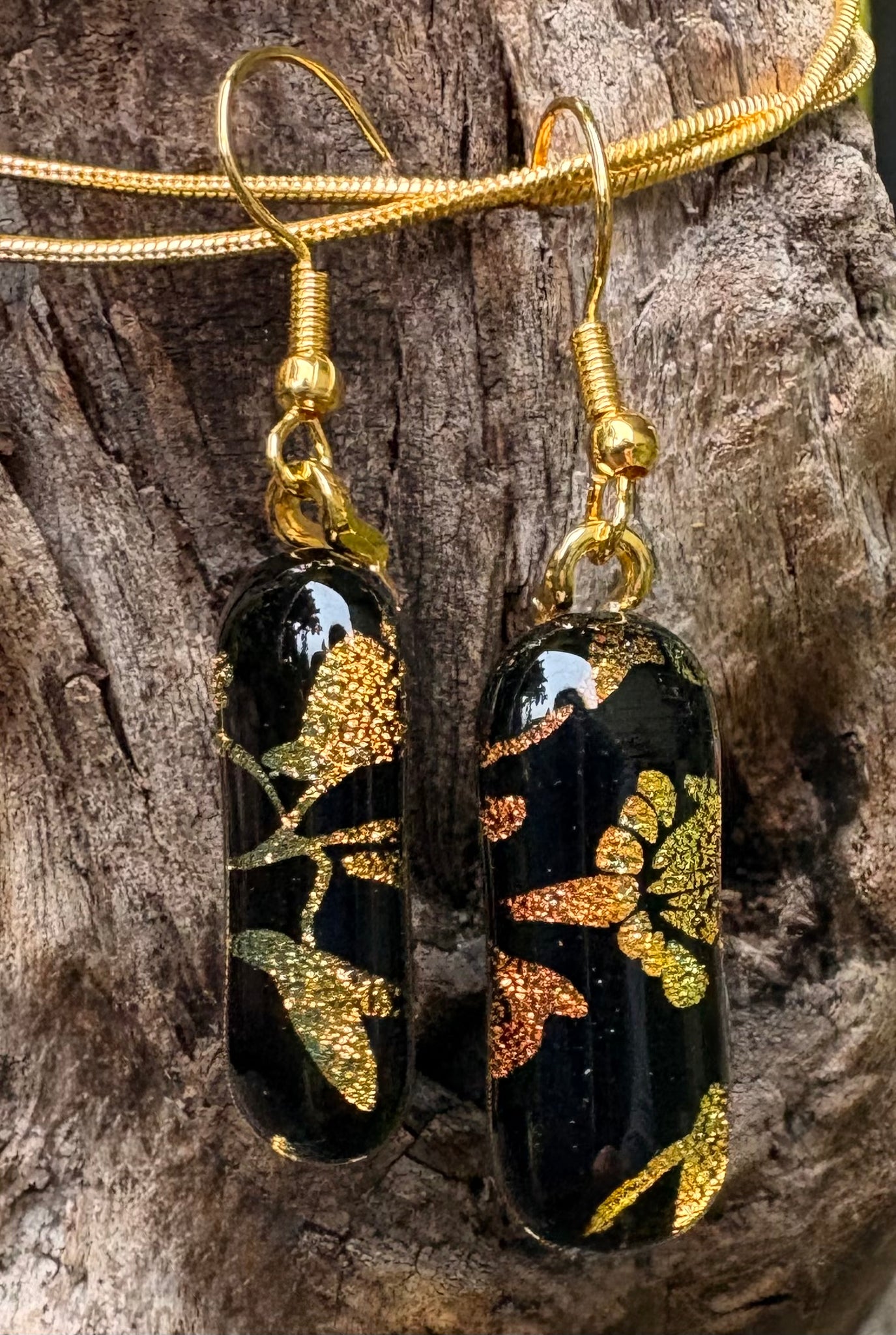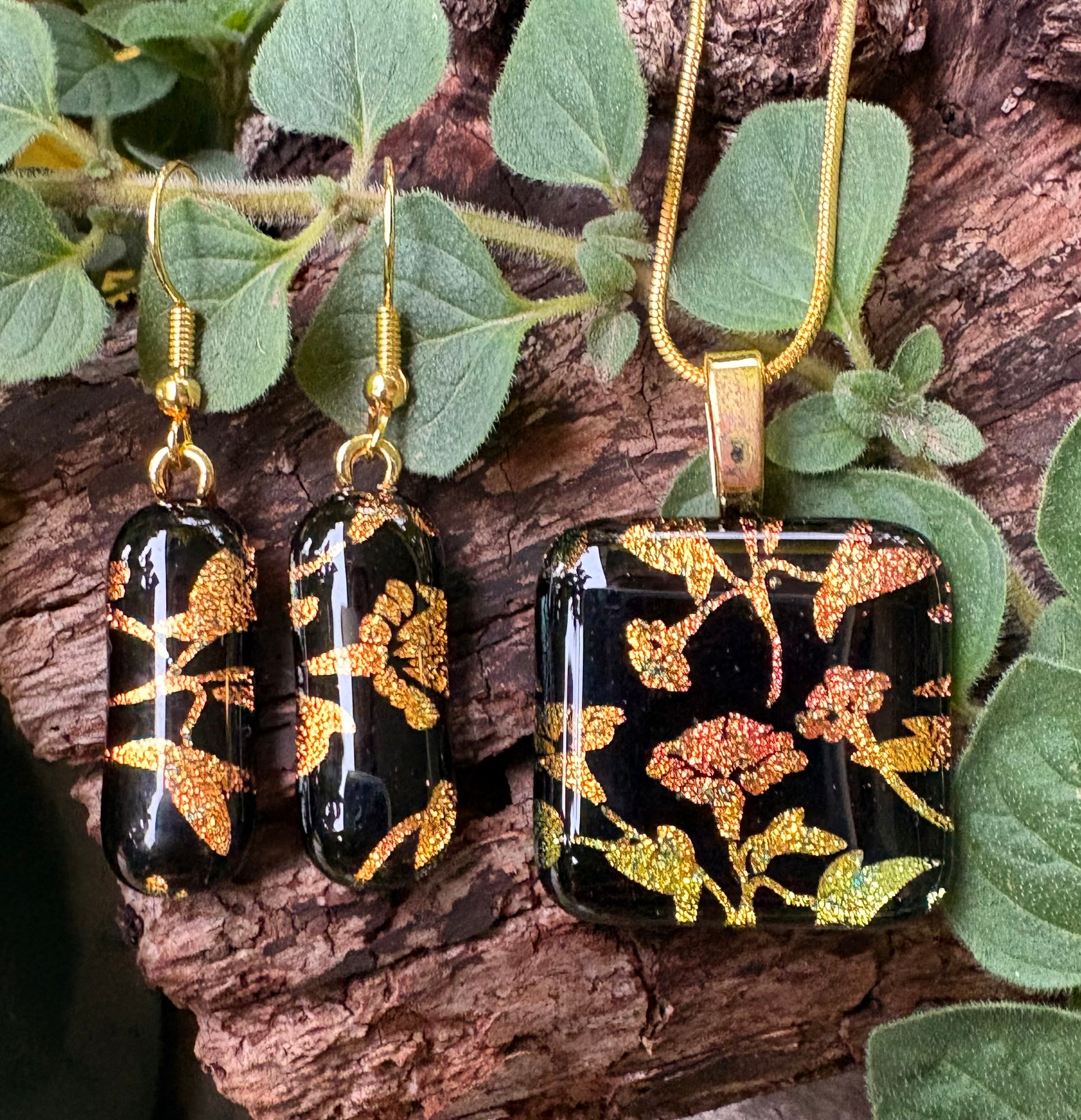 Fall’s warm tones, specifically warm rusty gold shifts to pale light green flowers in this shimmering dichroic pendant and earrings set. The pendant measures 1” x 1”, but with the bail, 1 3/8” by 1” and is on a golden colored snake chain which measures 23 3/4” in length. The earrings measure total 1 5/8” in length by 3/8” wide.