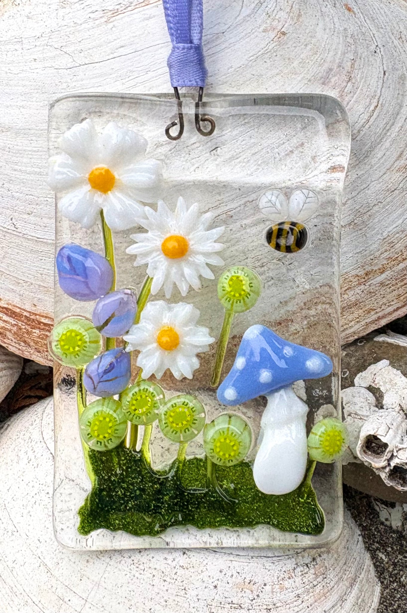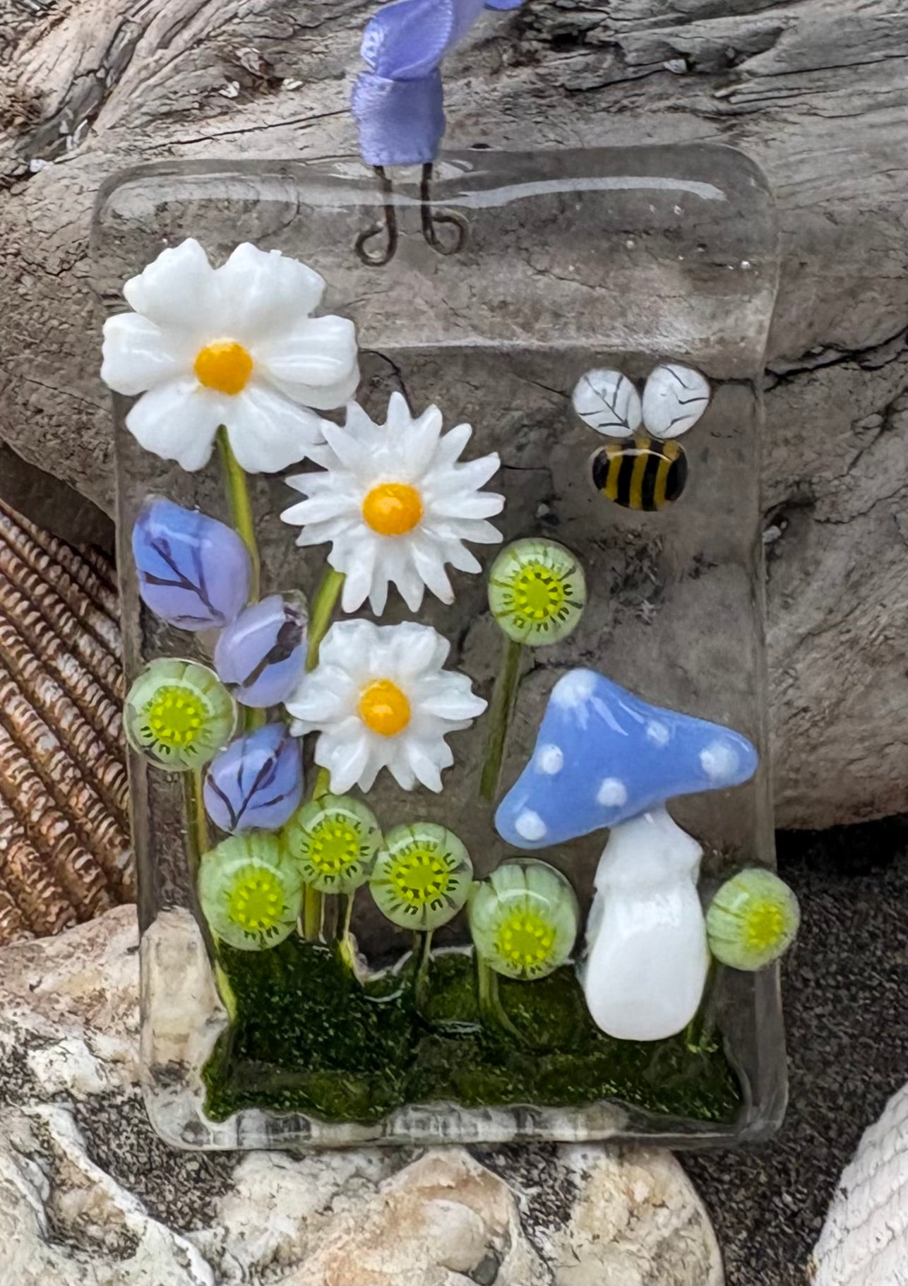 This Fused Glass Sun Catcher is handcrafted of mostly transparent colors to be illuminated by the sun. This one includes a Fairy Mushroom and a Bumblebee.