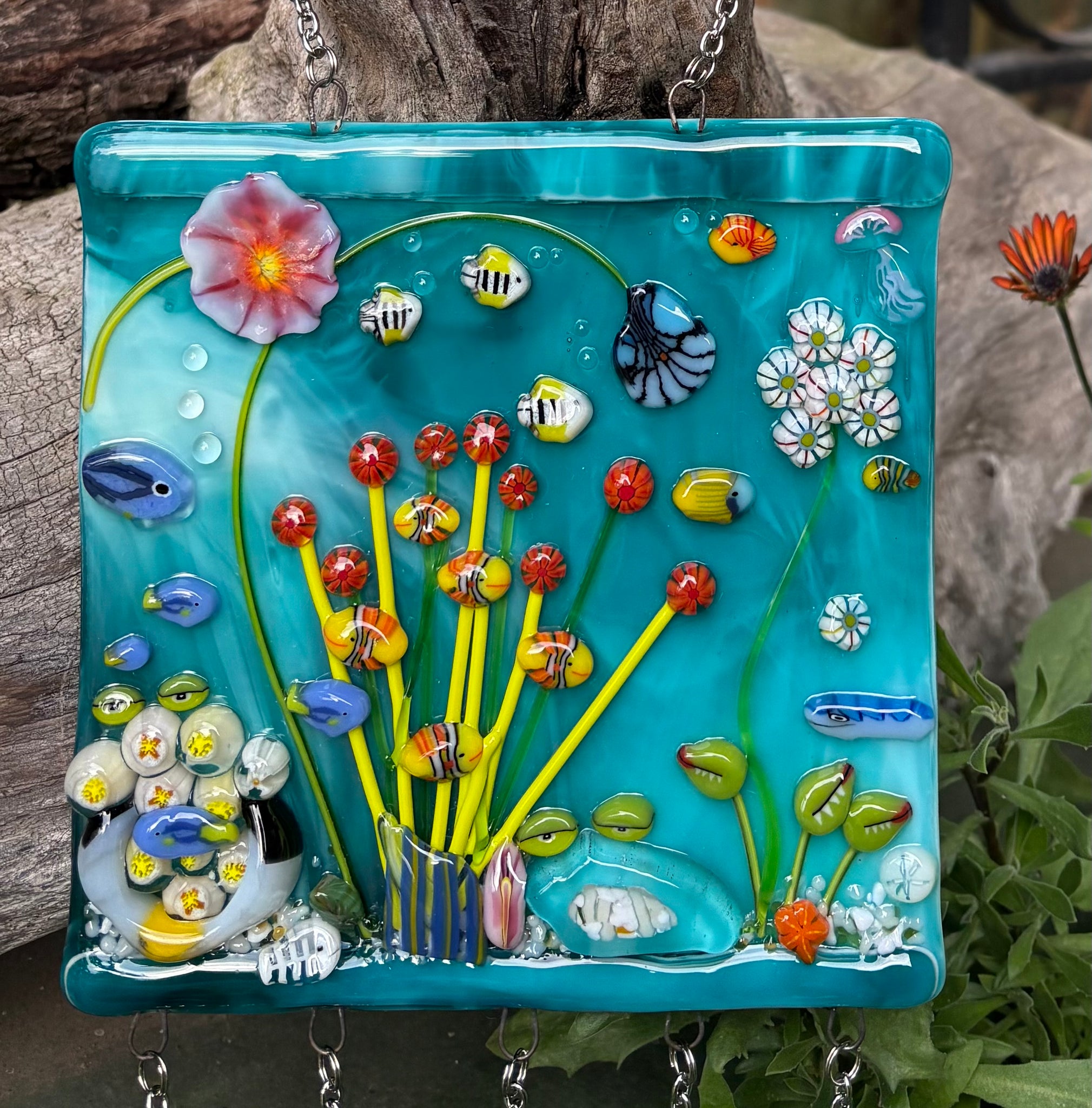 This Undersea Garden keeps the ocean within your reach with its vibrant colors and delicate sounds. Enjoy this stunning handmade glass wind chime (or more appropriately, gentle breeze chime) in a somewhat protected outdoor area. Or hand indoors in a sunny window or above a heat vent. The main plate of this artwork measures 5” x 5”;  hanging, this wind chime measures almost 15” from top the of chain to the bottom of the longest plank.